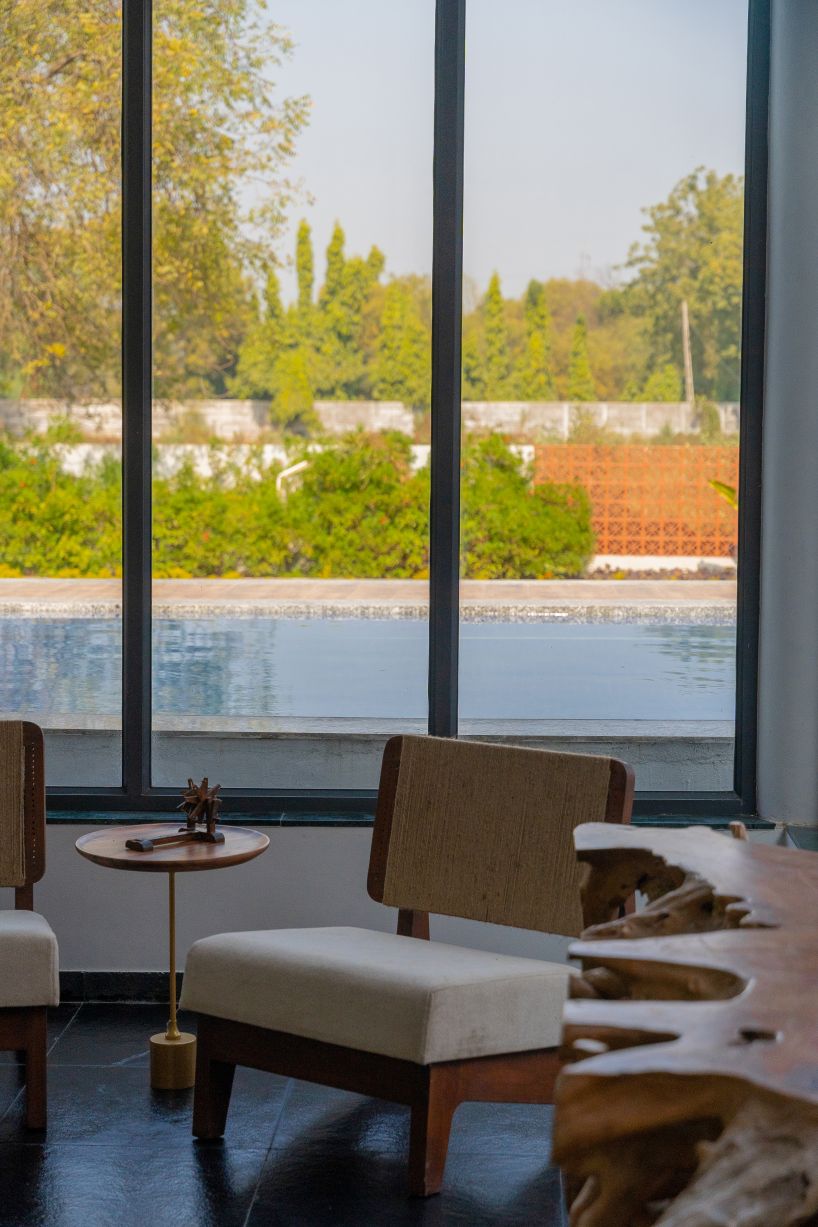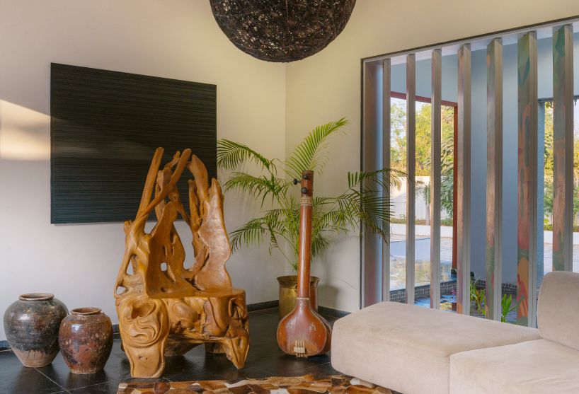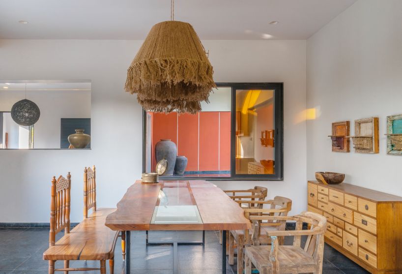 Designers at Maanchitra opt for materials with elemental and unprocessed finishes. Rough-cut natural stone, untreated timber, and lime-washed surfaces define the palette. The design intentionally avoids synthetic finishes such as laminates and polishes, allowing the building materials to weather naturally over time. Surface imperfections and material aging are integrated as part of the design intent, contributing to the villa’s evolving character.
