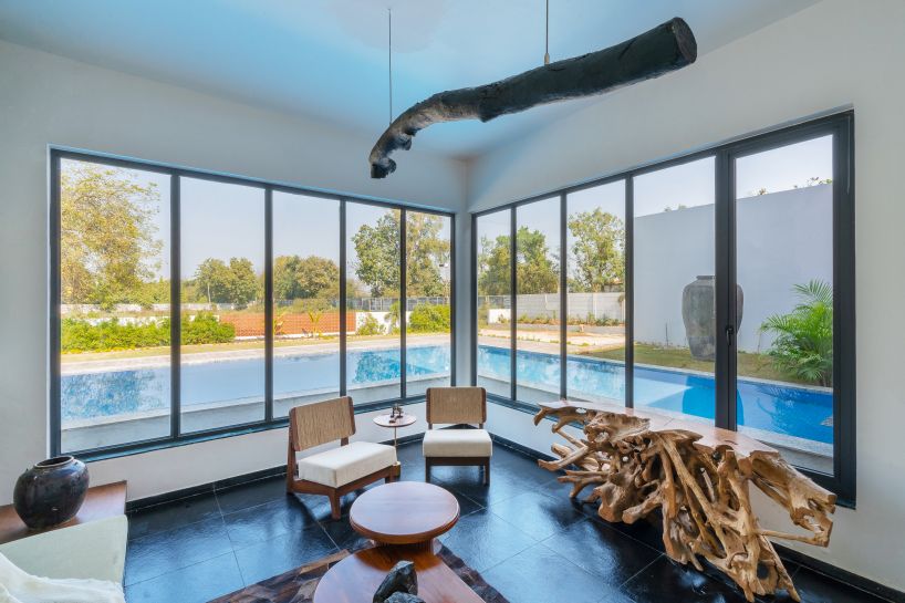 Located on the rural outskirts of Vadodara, India, The Silent Wall is a weekend villa designed by Maanchitra that explores restraint, spatial sequencing, and material clarity. The project takes a deliberate departure from conventional farmhouse typologies by introducing a single, linear wall as the central architectural gesture. Standing at the site’s edge, the unbroken wall acts as both a visual and spatial threshold. It is neither a gate nor an enclosure, but rather a pause that defines entry. Taller and more prominent than its surroundings, the wall establishes a strong vertical mass that shapes the initial spatial experience, drawing focus and momentarily halting movement before transition into the house.