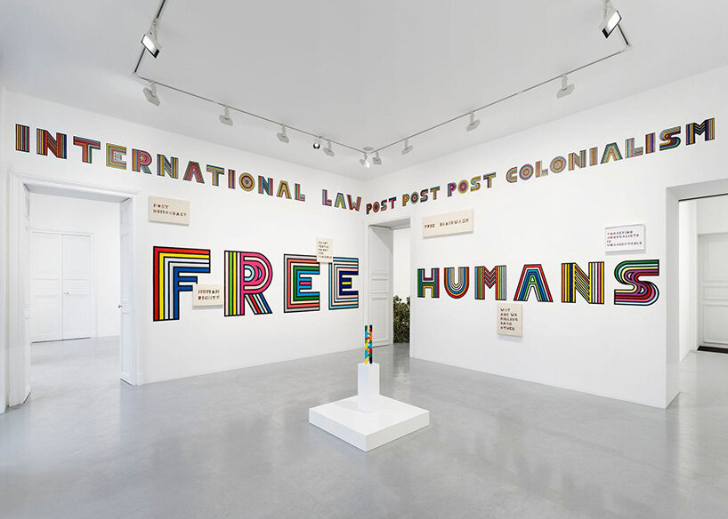 A sequence of environments that oscillate between playfulness and confrontation forms the exhibition at Perrotin Paris. Hand-painted phrases such as INTERNATIONAL LAW, FREE, and HUMANS appear in vivid colors, initially disarming before revealing their political charge. As the museum director of the Museums Commission, Saudi Arabia Ministry of Culture, Valentino Catricalà notes, the Italian artist’s work operates like a ‘punch to the gut,’ using familiar, even joyful, forms to deliver direct reflections on contemporary realities, including postcolonial structures and systems of power.