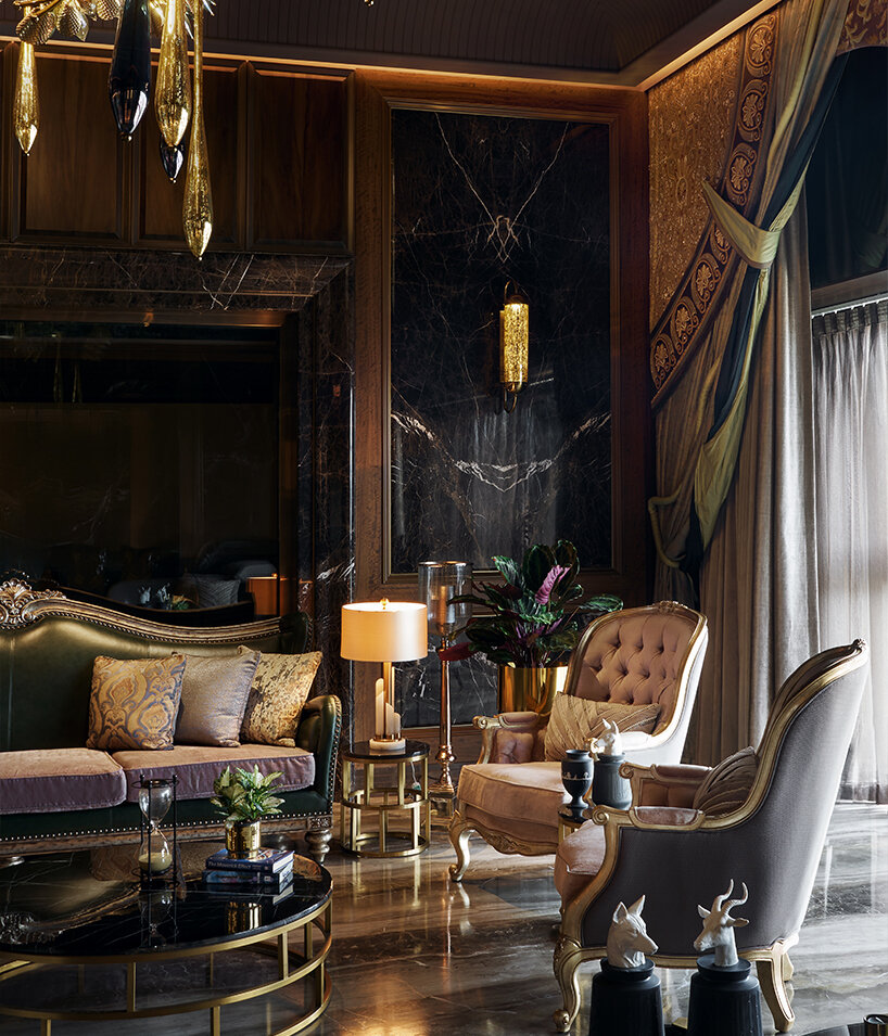 The penthouse residence by Metaphors is defined by a balance of extremes, where bold neo-classical elements are combined with the raw mass of brutalism. The architectural program rejects a singular aesthetic, instead opting for a material collision that pairs deep-veined, sculpted marbles with intricately detailed ceilings and embossed wall panels. This allows the residence to function as a versatile home, shifting between an expansive stage for high-society hosting and a series of intimate, quiet sanctuaries for family life.