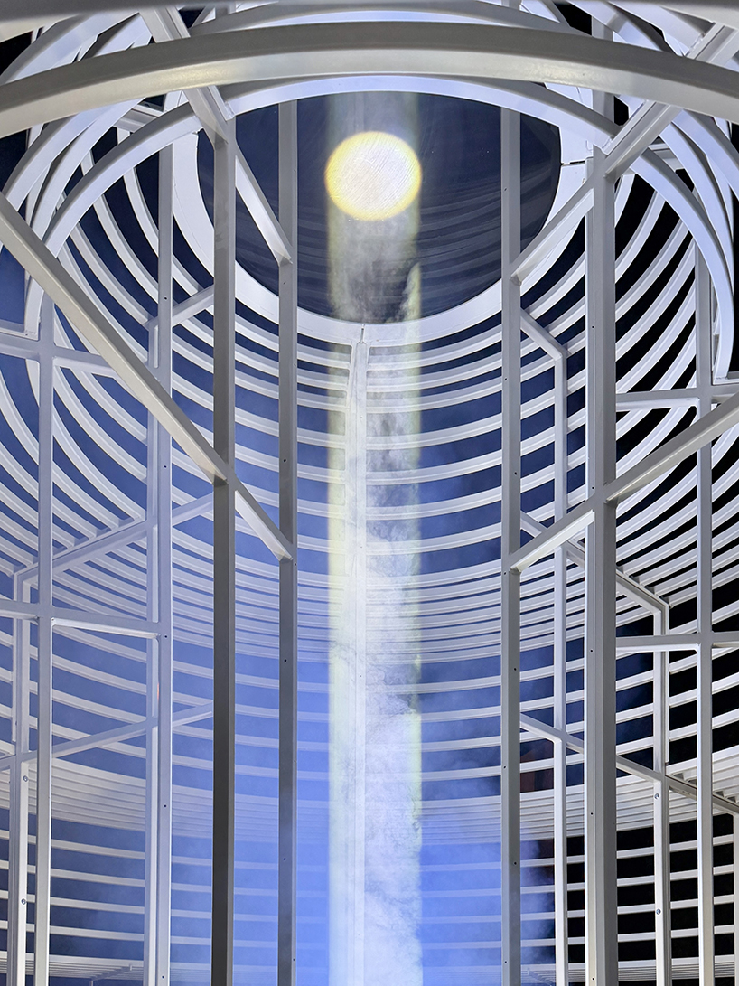 Karolina Halatek’s works are catalysts for experience. Using light as her central medium, she creates site-specific installations that integrate visual, architectural, and sculptural elements. She studied Design for Performance at UAL (UK), Fine Arts at UdK Berlin, and Media Art at the Academy of Fine Arts in Warsaw, Poland, and took part in Olafur Eliasson’s Institut für Raumexperimente. The Polish artist is a PhD candidate at the Academy of Fine Arts in Krakow and a visiting researcher at the Lighting Lab, Royal Danish Academy in Copenhagen. The installation was produced by TETRO+A agency and exhibited at the fifth edition of the Noor Riyadh festival titled ‘In the Blink of an Eye,’ Saudi Arabia, 2025.