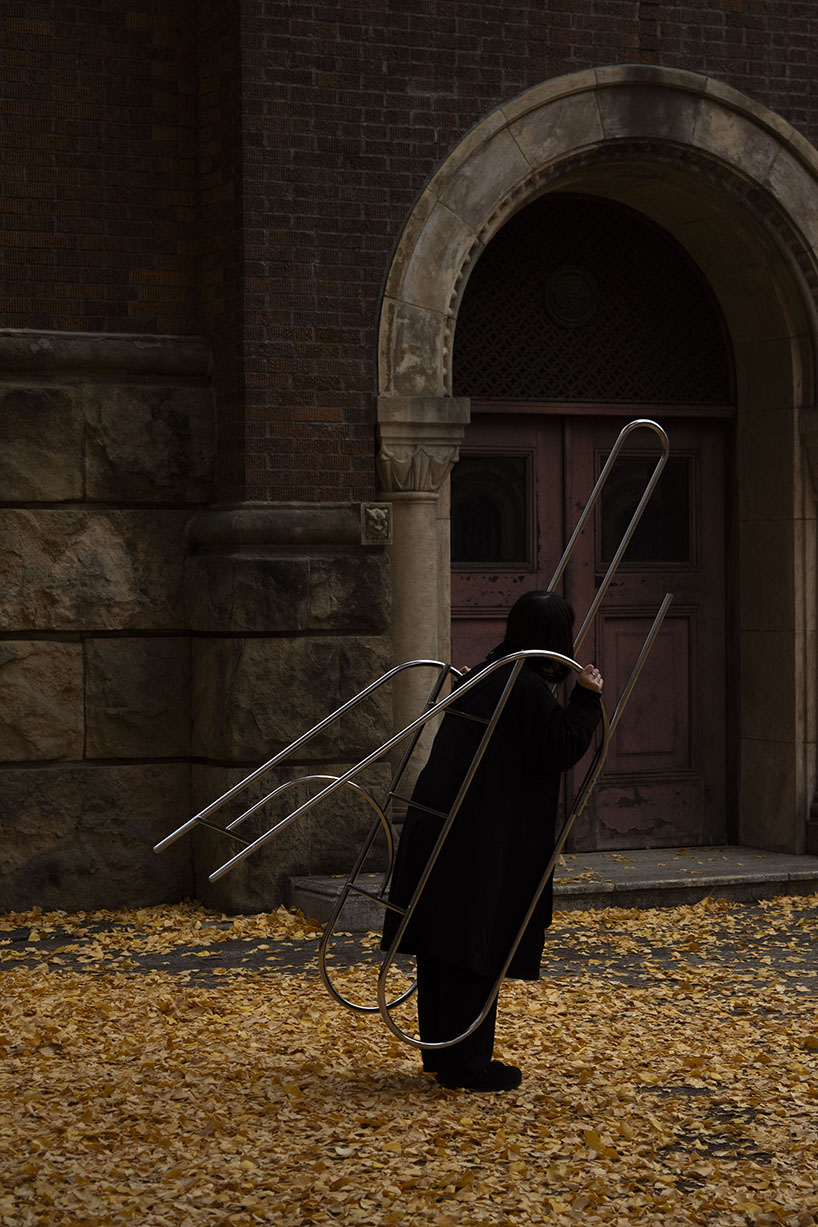 The ladder integrates the stability of conventional ladder construction with curved elements inspired by the forms of brass instruments. Polished stainless steel pipes define the structure, creating continuous lines that guide the eye along the frame. This approach positions the ladder as a functional object while introducing a visual language more commonly associated with musical instruments.