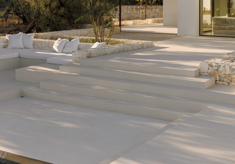white stone and microcement delineate the pool area, creating a relaxation zone amidst Mediterranean plants