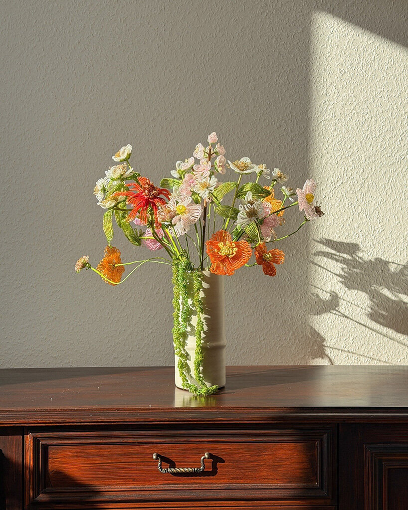 Thousands of tiny glass beads come together to form the intricate floral sculptures of musician and maker Henri Purnell. Working bead by bead, the artist recreates delicate blossoms that echo the organic irregularities of real flowers while shimmering with the luminosity of glass. From airy wildflower stems to full, colorful bouquets, each arrangement captures the fleeting beauty of botanical forms that remain permanently in bloom.