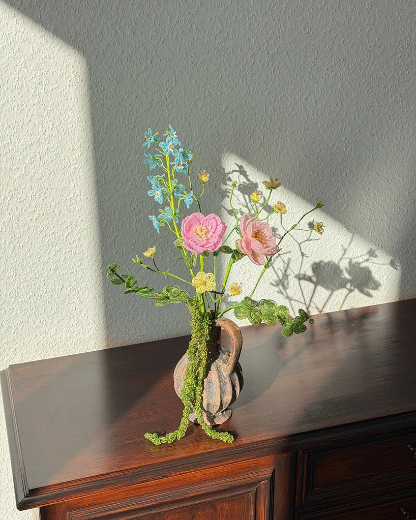 Many of the works are assembled into loose bouquets arranged in simple glass or ceramic vessels, allowing the stems to fan outward like freshly cut flowers. When placed in sunlight, the beads catch and refract light, casting intricate shadows that echo the delicate geometry of the beadwork.