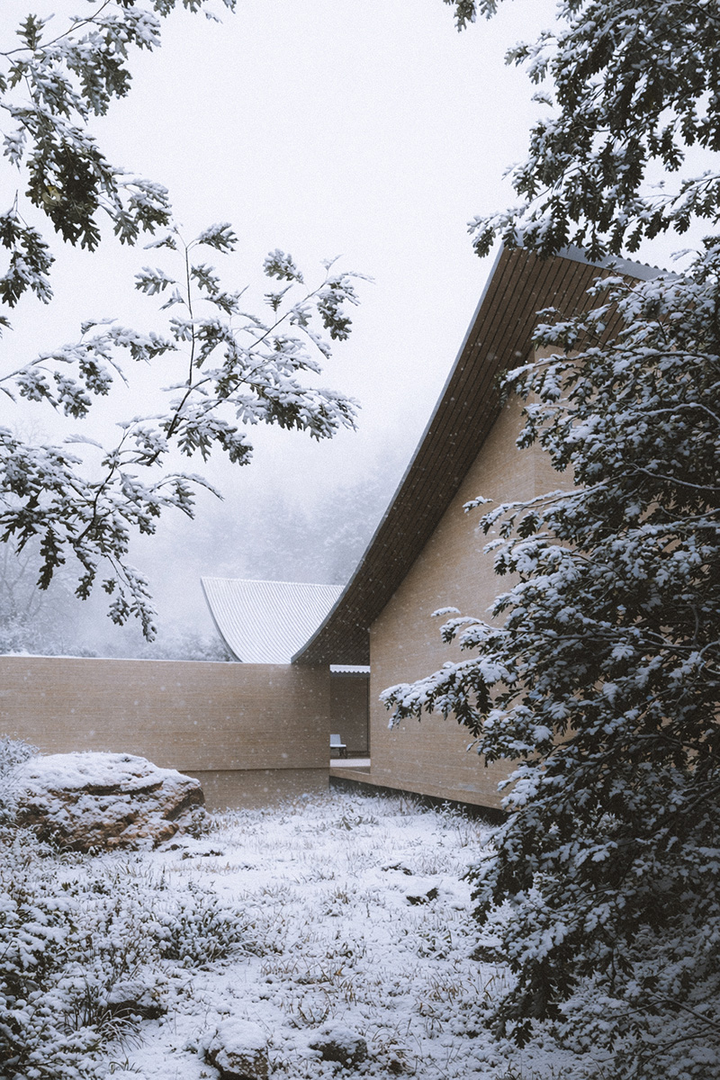 Water operates as both an organizer and a sensory element throughout the project. Rainfall is intentionally revealed through the skylight, landing on a central dining table and creating a direct connection between natural phenomena and daily living. This central water axis extends outward, transforming into a linear swimming pool that echoes the movement of streams descending from the mountains. Rainwater is collected and guided along terraces, shaping outdoor spaces and reinforcing the integration of precipitation into the architectural composition.